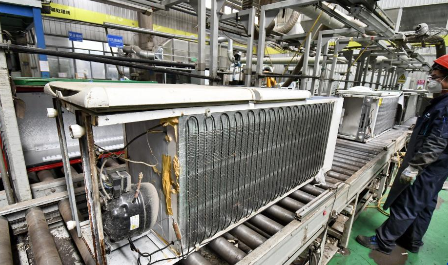 技术人员在北京市华新绿源环保股份有限公司的废弃冰箱拆解流水线上工作(5月6日摄)。