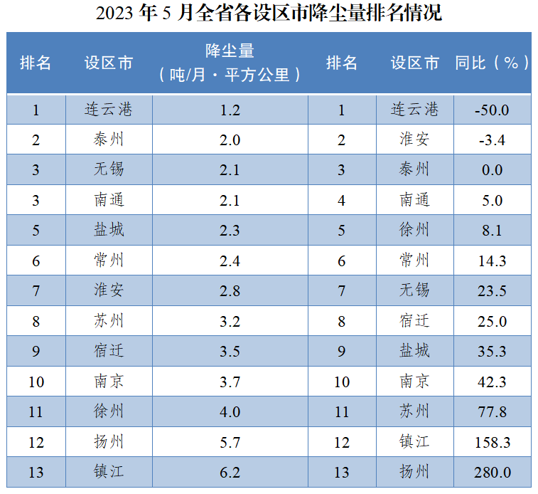 以上是小编收集整理的江苏省设区市降尘量排名(2023年5月)部分内容来自网络,如有侵权请联系删除:153045535@qq.com;
