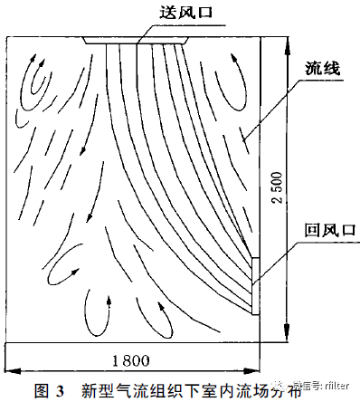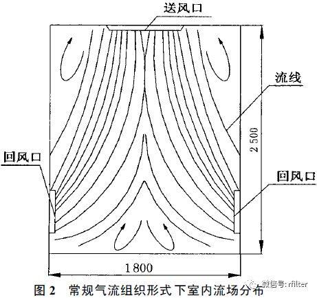 1000 级无尘车间常规送、回风方式下造成的室内气流分布见图2[2]。室内大部分区域, 尤其是工作区(距地面1 ~ 1 .5 m 左右的区域)处于主流区。因为通常