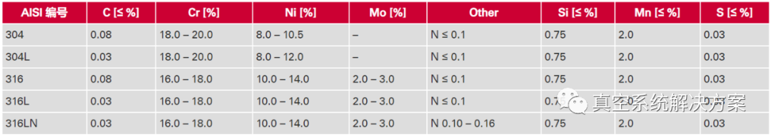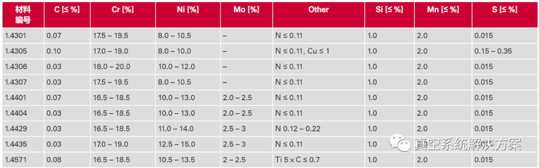 欧洲常用钢号可与AISI(美国钢铁协会)类似材料名称通用,如1.4301对应304、1.4307和1.4306对应304L、1.4404和1.4435对应316L以及1.4429对应316LN。不过,材料只是大约类似。真空应用的差异大多是非常微小的。然而,对于特殊要求,必须针对个别情况单独评估通用性。示例:如果某个部件需要材料1.4301,一般必须有相关材料证书。如果证书只显示材料304,则未满足要求。此时,证书中的名称很重要。如果满足相应的材料规格,制造商也可证明半成品具有几个名称。例如,如果材料被证明为1.4301、1.4307、304和304L,用途则会更加多样化。
