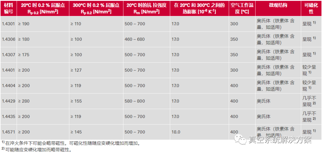 下表列出了真空技术中常用不锈钢的化学组成和性能。