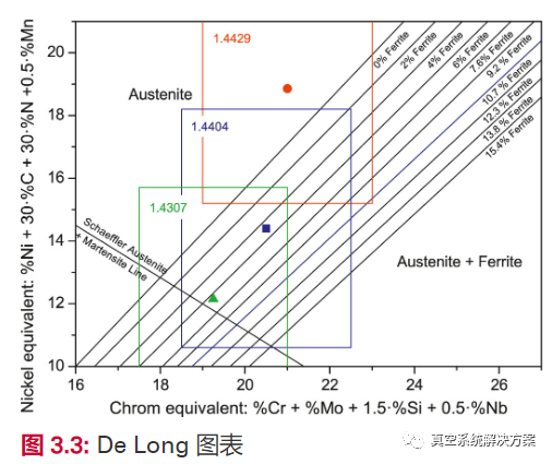 在图3.3中,对于某些不锈钢,显示了铬和镍当量区域(彩色矩形),并以图标给出其平均当量。