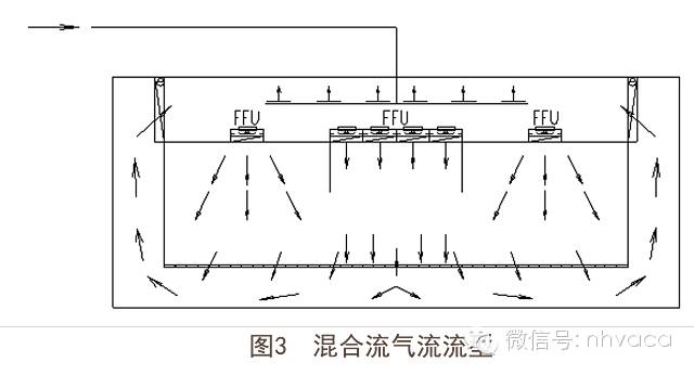混合流气流是将垂直单向流和非单向流两种气流组合在一起构成的气流流型。这种气流的特点是将垂直单向流面积压缩到最小,用大面积非单向流替代大面积单向流以利节省初投资和运行费。