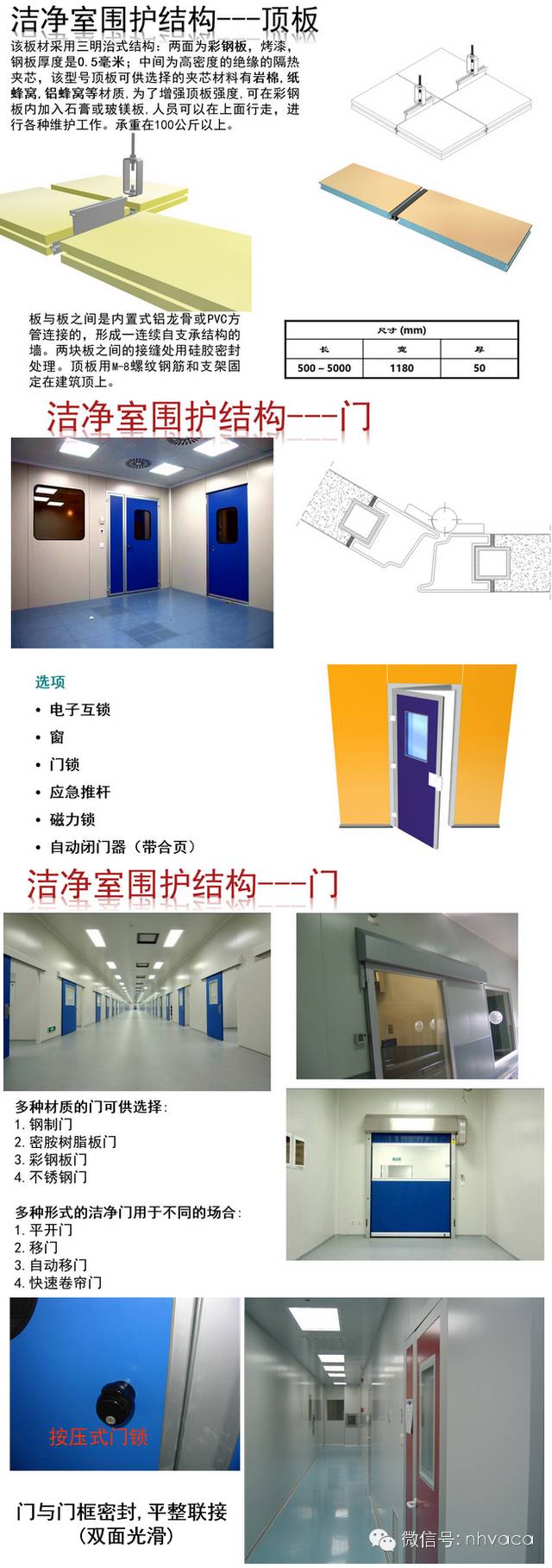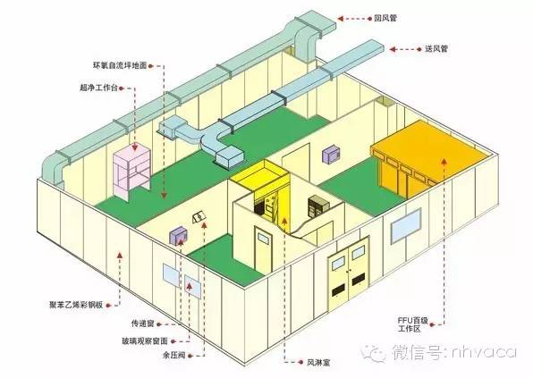 洁净室的系统构成:大风量的循环空气(考虑局部排气)和高性能的过滤器;符合需要的控制温湿度的空调设备(要考虑内部发热);设置控制外部尘埃带入室内的风淋室,传递窗等设备。四周不易粘附尘埃,表面光滑,洁净的房间。
