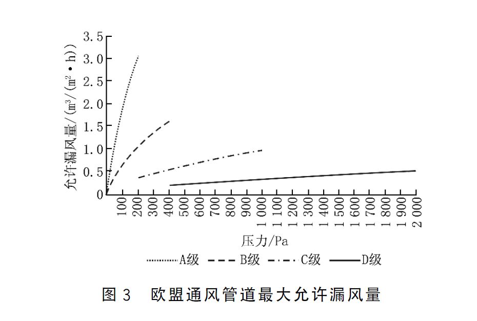 欧盟通风管道气密性划分为4个等级,其中D级为特殊管道专用气密性等级,4个漏风常数相邻之间也为3倍关系,并且A,B,C级的漏风常数和我国的低、中、高压等级的漏风常数对应相比低约8%;