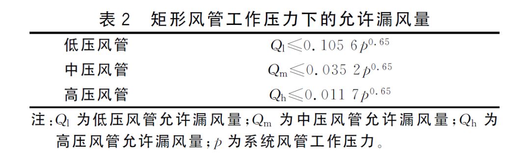 该规范于1998年5月1日起取代1982年版规范,是首次明确提出允许漏风量要求的规范,其第3.1.14条以表格的形式给出了低压、中压、高压3个压力等级下的允许漏风量上限值,见表1。