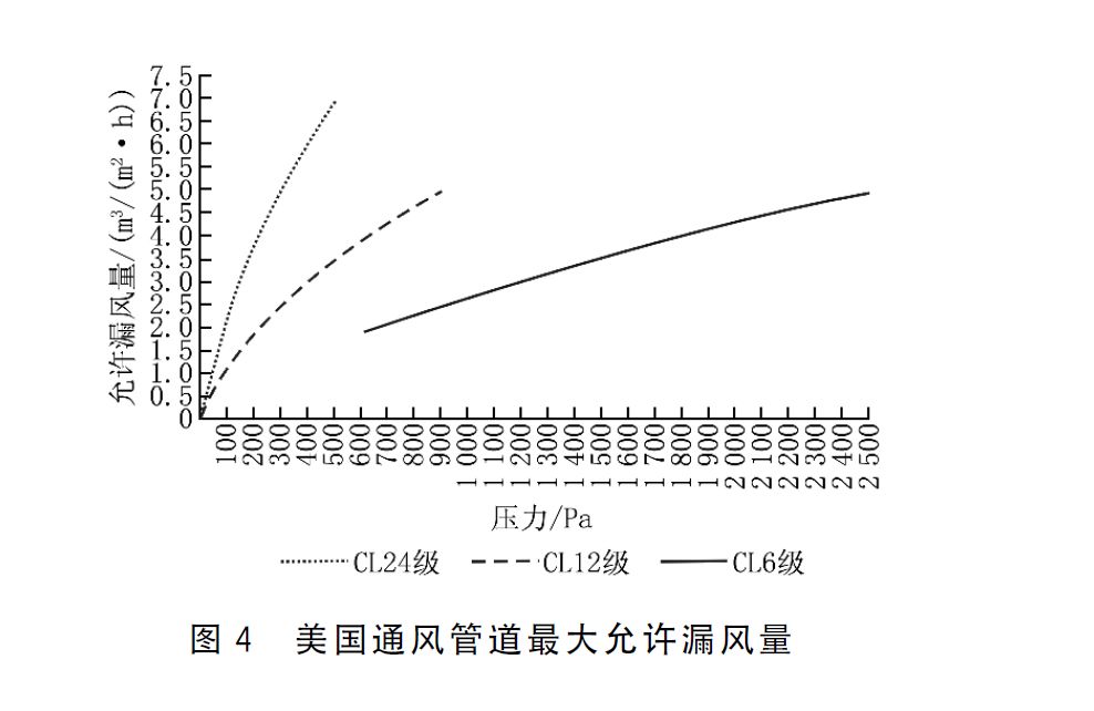 我国中压/B级对应美国CL12级的全部和CL16级的前一部分,小于900Pa时,2条曲线变化趋势相同,最大允许漏风量中国<美国,900~1,500Pa时,最大允许漏风量中国<美国;