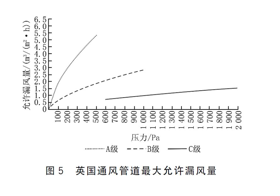 我国通风系统管道的低压/A级、中压/B级和高压/C级风管对应英国通风系统管道的A级、B级和C级,最大允许漏风量曲线变化趋势基本相同