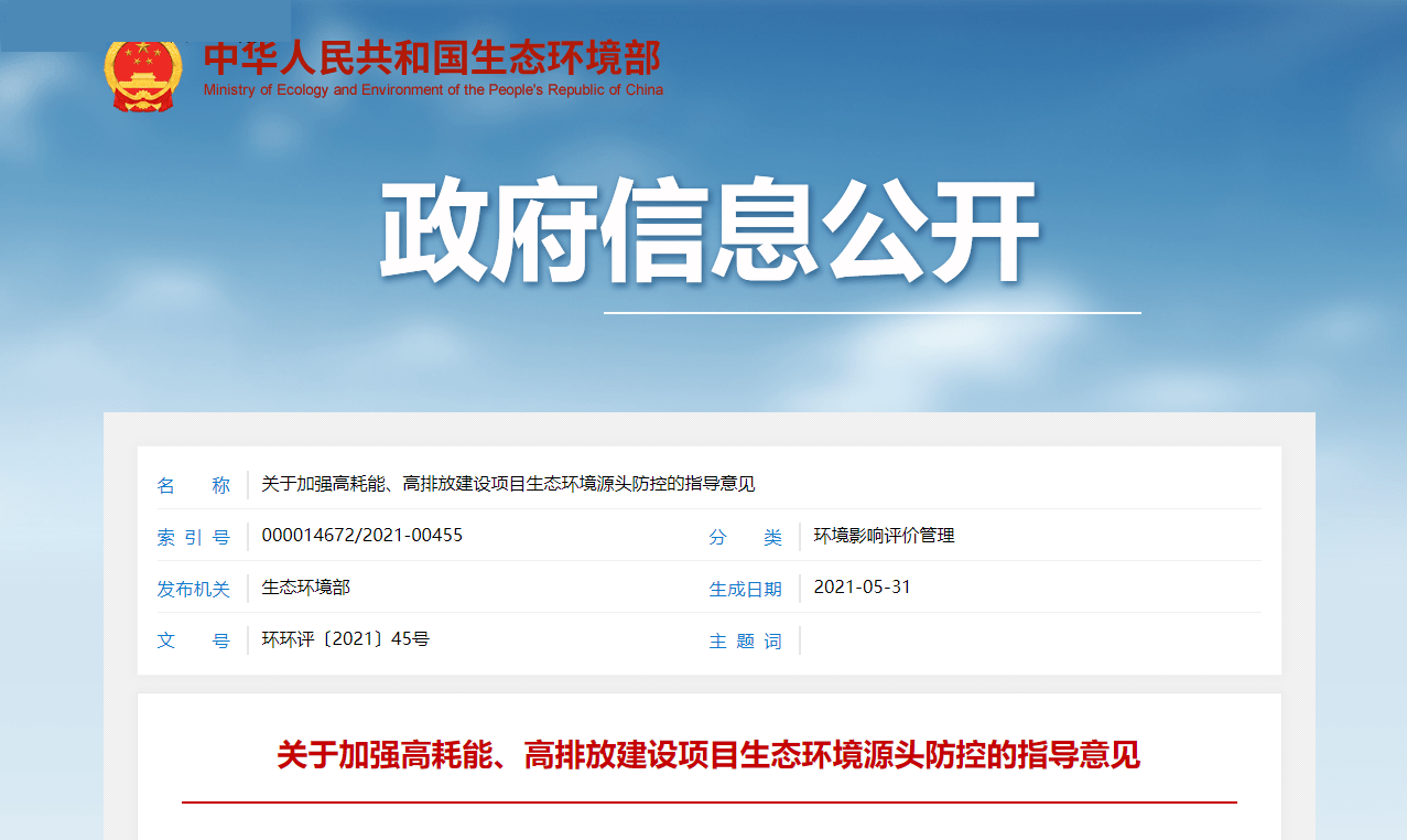 今年5月31日,我国生态环境部印发《关于加强高耗能、高排放建设项目生态环境源头防控的指导意见》,其中第7条明确指出:将碳排放影响评价纳入环境影响评价体系。