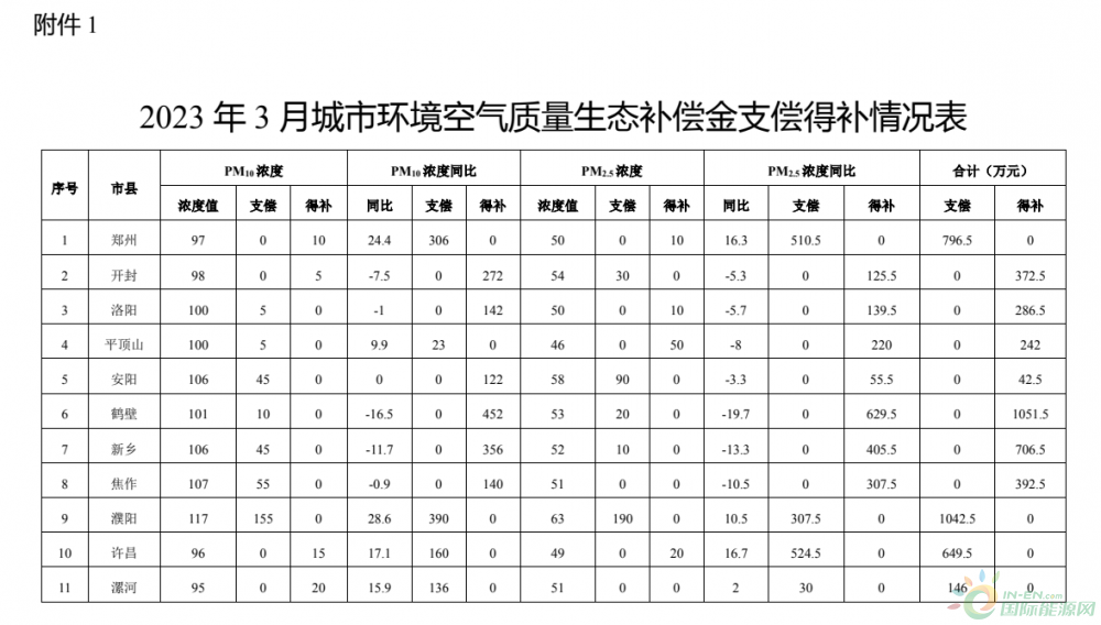河南省生态环境厅关于2023年3月城市环境空气质量生态补偿情况的函