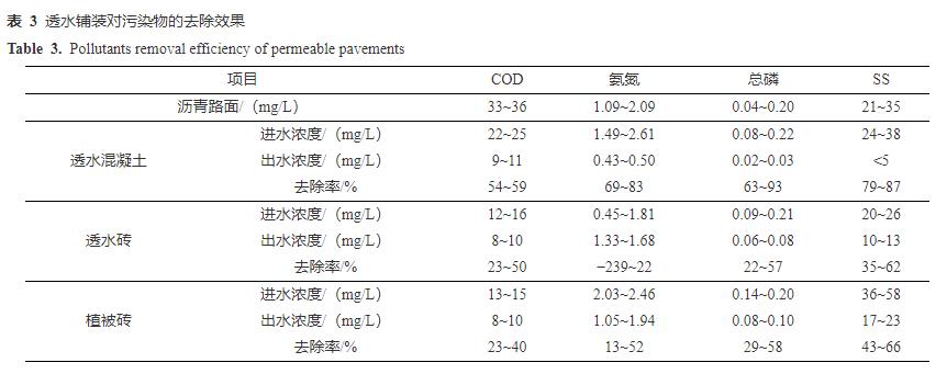 本研究中透水铺装建成2年,使用年限较短,对污染物的去除效果明显。有研究证明,随着使用年限的增长,透水铺装去除污染物的效果会逐步下降[25],但是通过清洗,可使透水铺装材料中污染物(特别是COD和氨氮)溶出,使其对污染物的去除效果有所恢复。因此,透水铺装工程应及时清洗维护,以保持其污染物去除效能[26]。