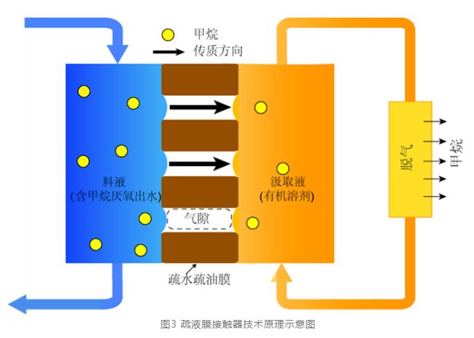 针对这一瓶颈难题, 本文提出了一种新型膜接触器技术-疏液膜接触器,其技术原理是利用非极性有机溶剂(十二烷)作为溶解甲烷的汲取液,甲烷在非极性有机溶剂中的溶解度远高于其在水中的溶解度,膜两侧的溶解度差异是甲烷传质的驱动力(见图3)。同时,非极性有机溶剂与水不互溶,有效抑制了水蒸气的传输。汲取液中的甲烷可以通过脱气实现富集回收,而脱气后的汲取液可以循环再利用,保证了系统的连续操作运行(Environmental Science & Technology Letters, 6 (2019) 228-234)。