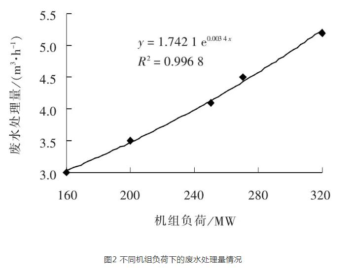 不同机组负荷下的废水处理量情况见图2。由图2可知,50%负荷工况下大于3 m3/h,75%工况下大于4 m3/h,满负荷工况下大于5 m3/h,完全满足机组负荷变化情况下脱硫废水处理要求。同时这部分烟气进入电除尘器后,废水蒸发增加了烟气湿度,从而使烟气飞灰比电阻得以下降,有利于提高电除尘器的除尘效率。蒸发的废水在脱硫吸收塔冷却后成为脱硫补充水,有利于降低脱硫系统水耗。