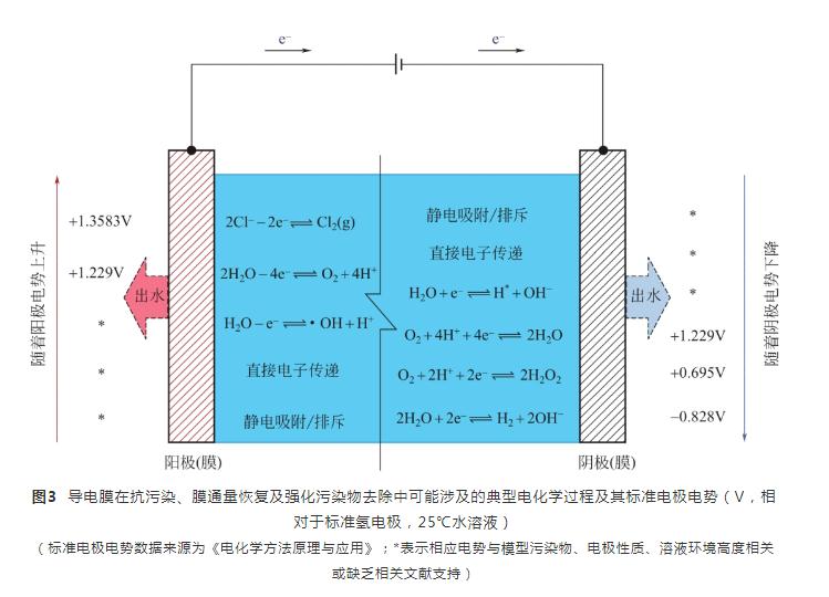 传统膜材料的抗污染性能优化主要是通过对膜材料表面或孔道内亲疏水性、zeta电位以及粗糙度的调控实现的,而功能膜材料(以导电膜为主)的抗污染性能主要依靠静电排斥作用、电化学氧化还原以及在较大电压时的电致气泡对膜表面的冲刷作用使污染物在膜表面、孔内沉积速率降低,从而降低清洗频率,延长膜的使用寿命。图3总结了导电膜作为阴极或阳极时可能发生的电化学过程,并给出了几个典型反应的标准电极电势。在中性条件下,许多有机污染物、微生物表面均带负电,因此抗污染功能膜材料往往被用作阴极材料。此时,功能膜整体带负电,静电排斥发挥主要作用,降低微生物和有机物在膜面附着的倾向。且在电势低于一定值时,可通过将水中的溶解氧在功能膜上还原为双氧水(H2O2),进而氧化膜表面或孔内的部分有机污染物或微生物。而当电势低于析氢电位时,氢气的产生也可能会起到冲刷膜表面的作用,进一步强化抗污染能力。当功能膜被用作阳极材料时,主要依靠电极氧化能力直接电子传递或产生ROS(如·OH)氧化污染物或微生物,以及在高电势时析氧反应对膜面的冲刷作用。表1总结了近年来基于二维纳米材料的功能膜在抗污染中的研究进展。