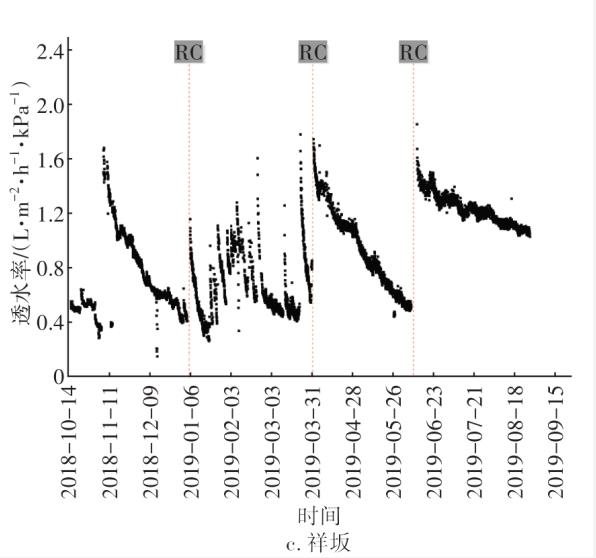 分别选取洋里四期、洋里二期和祥坂的1个膜池,2018年8月—2019年8月期间其透水率随时间的变化情况如图1所示。3个MBR工程的运行条件类似,其中,洋里四期的膜运行年限最长,整体透水率较低。