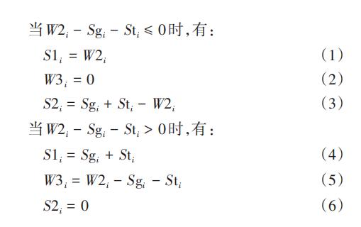 根据奥运年全年365d逐日的生活排水量W1i,以及冲厕Sti、绿化浇洒Sgi等用途的逐日用水量,按照下式计算再生水实际用水量S1i、再生水排放量W3i和自来水补水量S2i。