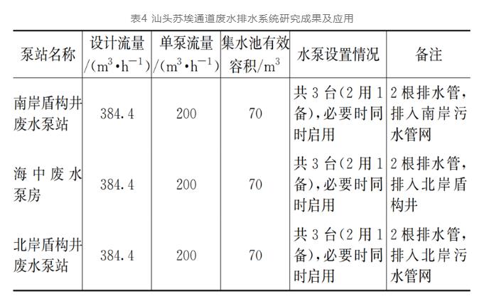 汕头苏埃通道共设置3处废水泵房,分别为南岸盾构井废水泵房、海中废水泵房、北岸盾构井废水泵房,海中废水泵房的研究成果,同样适用于南、北岸盾构井废水泵房。南、北岸盾构井废水泵房利用回填设置,无工程费用增加,设置条件较好,海中废水泵房因埋深大,水泵扬程高,选型比较困难,一般采用两级提升方案,即海中废水泵房废水排入盾构井废水泵房,之后盾构井废水泵房排出室外接市政污水管网,汕头苏埃通道废水排水系统研究成果及应用见表4。