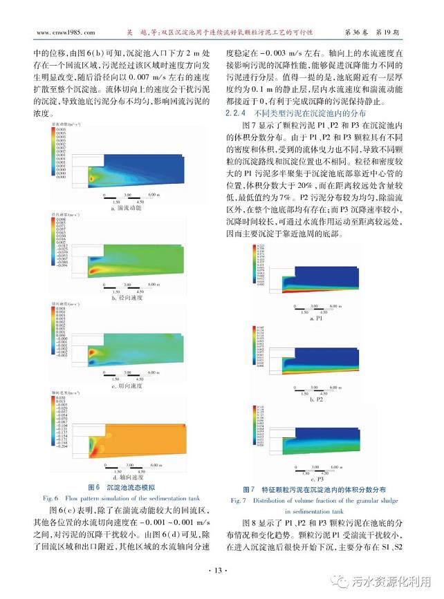 摘要:选取一座已初步形成好氧颗粒污泥的工业污水处理厂的辐流式沉淀池为研究对象,结合实际运行情况建立固液二相流模型,分析沉淀池内活性污泥的沉降性能和分布规律。从沉淀池底径向距离中心1、6和12 m处取得3个污泥样本S1、 S2和S3,其中S1的平均粒径(294.6 μm)远高于S2(142.8 μm)和S3(55.2 μm),对应的污泥指数(SVI)分别为56.2、63.4和81.3 mL/g。综合试验结果和计算流体力学(CFD)模拟结果可以发现,沉淀池内颗粒污泥主要集中在半径为1~6 m的圆环区域内。因此,可以通过选择性回流中心区域内的颗粒污泥来制造选择压,从而实现连续流工艺的污泥颗粒化。