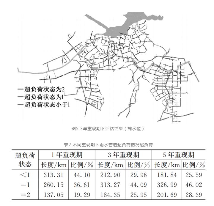 按照不同降雨条件下管道所处的运行状态进行模拟,得到管网运行负荷,如图5所示:在3年一遇降雨情况下,超负荷管道(红色和绿色管道,图中枚红色为支流)主要分布在建成区,其中,金山湖沿江片区雨水管道总体管道超载情况就较为严重;不同降雨情况下的管道超负荷状态分布情况见表2,其中1年一遇降雨管道超负荷运行占比55.9%,3年一遇降雨管道超负荷运行占比70.04%,5年一遇降雨管道超负荷运行占比74.41%。