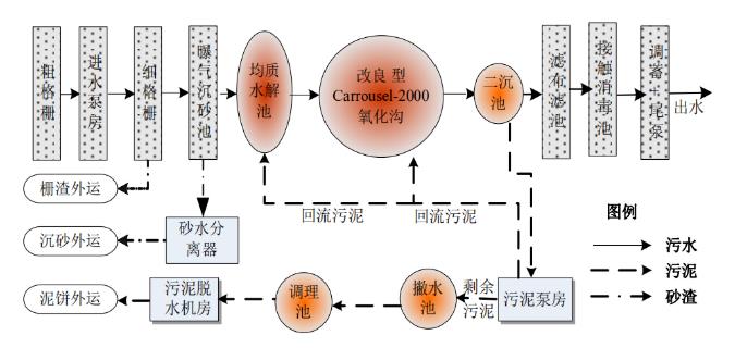 提标改造前污水处理厂原工艺流程为“粗格栅及进水泵房→细格栅及曝气沉砂池→水解酸化池→改良型Carrousel-2000氧化沟→二沉池→滤布滤池→接触消毒池→蓄水池→尾水泵房排海”,污泥处理采用“污泥浓缩+调理改性+板框压滤”工艺。