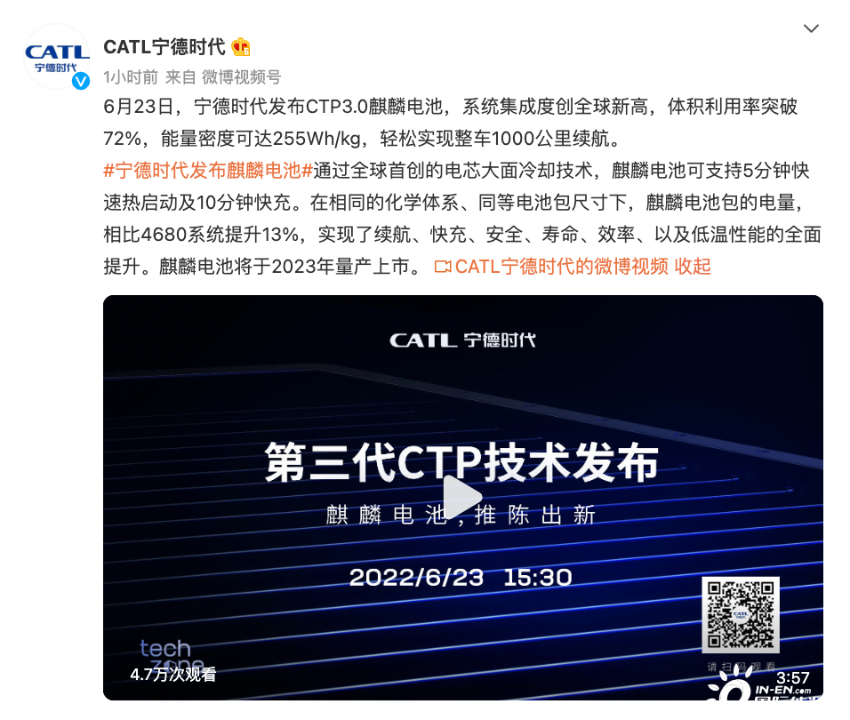 6月23日,宁德时代正式举行了“麒麟电池,推陈出新”第三代CTP技术新闻发布会,正式发布了CTP3.0麒麟电池,系统集成度创全球新高,体积利用率破72%,能量密度可达255Wh/kg,可实现整车1000公里续航,将于2023年量产上市。