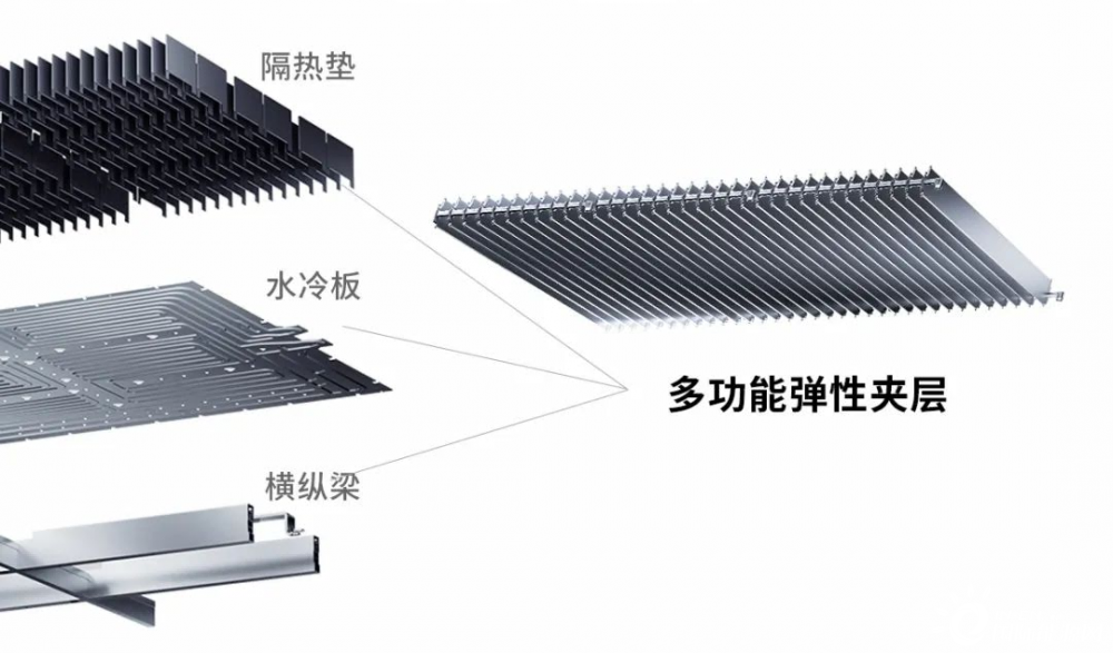 宁德时代指出,CTP3.0麒麟电池开创性地取消了横纵梁、水冷板与隔热垫原本各自独立的设计,集成为多功能弹性夹层,提高系统集成效率。